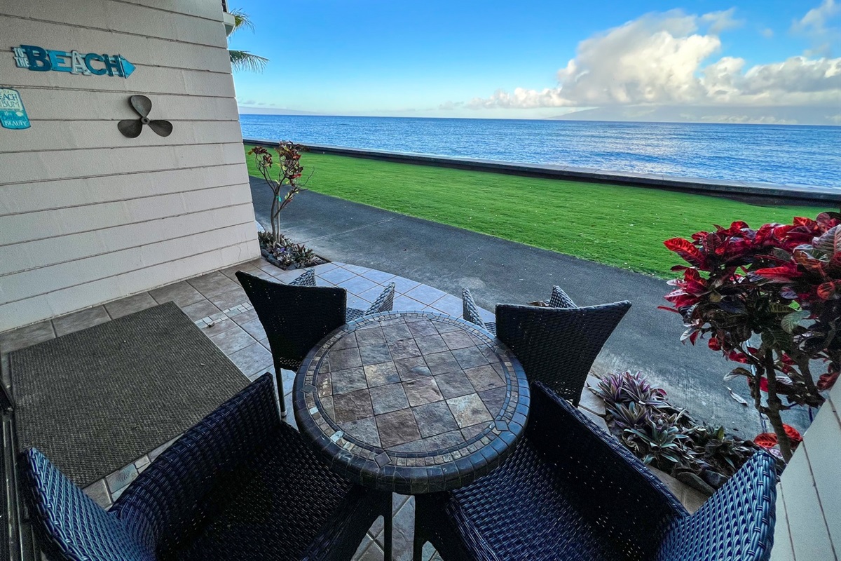 Kahana Reef 120 has an unbeatable location just yards away from the Pacific Ocean. Enjoy beautiful, unobstructed, panoramic ocean views from your own spacious and private lanai. View the neighboring islands of Lanai and Molokai against the backdrop of a breathtaking sunset while dining or having cocktails with friends and family. Watch whales, turtles, monk seals, and spinner dolphins swimming playfully in the beautiful, blue Pacific Ocean right from the privacy of your patio.